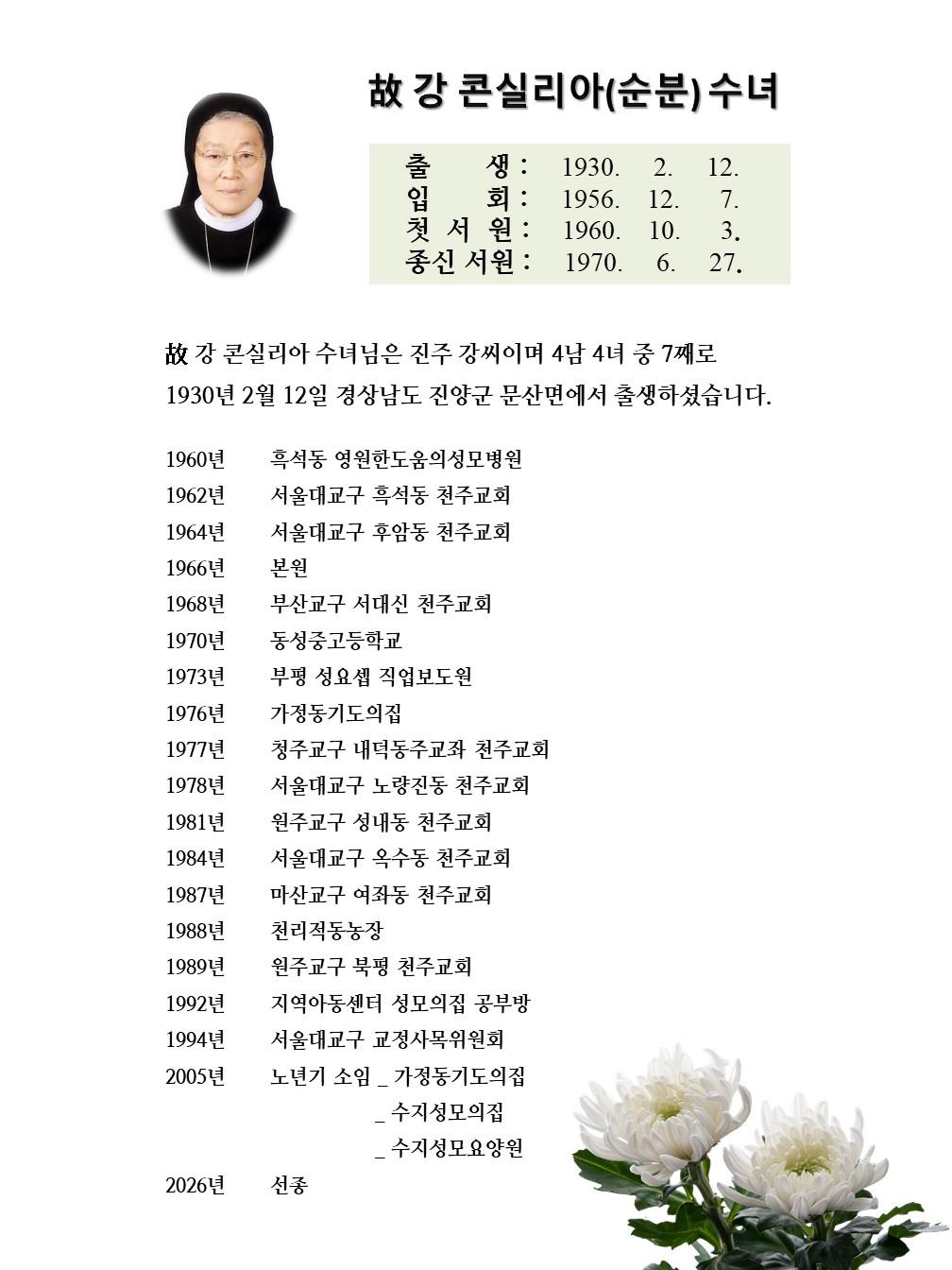 주님, 강 콘실리아 수녀에게 영원한 안식을 주소서
