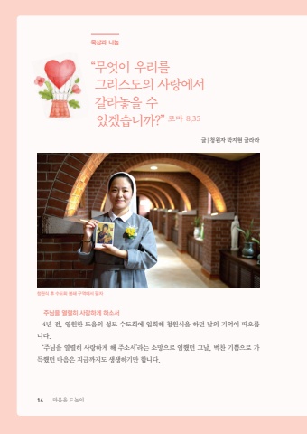 14 %ub9c8%uc74c%uc744 %ub4dc%ub192%uc774%uc8fc%ub2d8%uc744 %uc5f4%ub82c%ud788 %uc0ac%ub791%ud558%uac8c %ud558%uc18c%uc11c4%ub144 %uc804, %uc601%uc6d0%ud55c %ub3c4%uc6c0%uc758 %uc131%ubaa8 %uc218%ub3c4%ud68c%uc5d0 %uc785%ud68c%ud574 %uccad%uc6d0%uc2dd%uc744 %ud558%ub358 %ub0a0%uc758 %uae30%uc5b5%uc774 %ub5a0%uc624%ub985%ub2c8%ub2e4. %u2018%uc8fc%ub2d8%uc744 %uc5f4%ub82c%ud788 %uc0ac%ub791%ud558%uac8c %ud574 %uc8fc%uc18c%uc11c%u2019%ub77c%ub294 %uc18c%ub9dd%uc73c%ub85c %uc784%ud588%ub358 %uadf8%ub0a0, %ubc85%ucc2c %uae30%uc068%uc73c%ub85c %uac00%ub4dd%ud588%ub358 %ub9c8%uc74c%uc740 %uc9c0%uae08%uae4c%uc9c0%ub3c4 %uc0dd%uc0dd%ud558%uae30%ub9cc %ud569%ub2c8%ub2e4. %uccad%uc6d0%uc2dd %ud6c4 %uc218%ub3c4%ud68c %ubd09%uc1c4 %uad6c%uc5ed%uc5d0%uc11c %ud544%uc790%ubb35%uc0c1%uacfc %ub098%ub214%u201c%ubb34%uc5c7%uc774 %uc6b0%ub9ac%ub97c %uadf8%ub9ac%uc2a4%ub3c4%uc758 %uc0ac%ub791%uc5d0%uc11c%uac08%ub77c%ub193%uc744 %uc218%uc788%uaca0%uc2b5%ub2c8%uae4c?%u201d %ub85c%ub9c8 8,35%uae00 | %uccad%uc6d0%uc790 %ubc15%uc9c0%ud604 %uae00%ub77c%ub77c