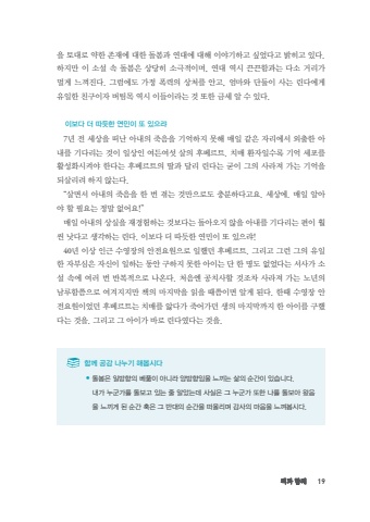 %ucc45%uacfc %ud568%uaed8 19%uc744 %ud1a0%ub300%ub85c %uc57d%ud55c %uc874%uc7ac%uc5d0 %ub300%ud55c %ub3cc%ubd04%uacfc %uc5f0%ub300%uc5d0 %ub300%ud574 %uc774%uc57c%uae30%ud558%uace0 %uc2f6%uc5c8%ub2e4%uace0 %ubc1d%ud788%uace0 %uc788%ub2e4. %ud558%uc9c0%ub9cc %uc774 %uc18c%uc124 %uc18d %ub3cc%ubd04%uc740 %uc0c1%ub2f9%ud788 %uc18c%uadf9%uc801%uc774%uba70, %uc5f0%ub300 %uc5ed%uc2dc %ub048%ub048%ud568%uacfc%ub294 %ub2e4%uc18c %uac70%ub9ac%uac00 %uba40%uac8c %ub290%uaef4%uc9c4%ub2e4. %uadf8%ub7fc%uc5d0%ub3c4 %uac00%uc815 %ud3ed%ub825%uc758 %uc0c1%ucc98%ub97c %uc548%uace0, %uc5c4%ub9c8%uc640 %ub2e8%ub458%uc774 %uc0ac%ub294 %ub9b0%ub2e4%uc5d0%uac8c %uc720%uc77c%ud55c %uce5c%uad6c%uc774%uc790 %ubc84%ud300%ubaa9 %uc5ed%uc2dc %uc774%ub4e4%uc774%ub77c%ub294 %uac83 %ub610%ud55c %uae08%uc138 %uc54c %uc218 %uc788%ub2e4. %uc774%ubcf4%ub2e4 %ub354 %ub530%ub4ef%ud55c %uc5f0%ubbfc%uc774 %ub610 %uc788%uc73c%ub7b47%ub144 %uc804 %uc138%uc0c1%uc744 %ub5a0%ub09c %uc544%ub0b4%uc758 %uc8fd%uc74c%uc744 %uae30%uc5b5%ud558%uc9c0 %ubabb%ud574 %ub9e4%uc77c %uac19%uc740 %uc790%ub9ac%uc5d0%uc11c %uc678%ucd9c%ud55c %uc544%ub0b4%ub97c %uae30%ub2e4%ub9ac%ub294 %uac83%uc774 %uc77c%uc0c1%uc778 %uc5ec%ub4e0%uc5ec%uc12f %uc0b4%uc758 %ud6c4%ubca0%ub974%ud2b8. %uce58%ub9e4 %ud658%uc790%uc77c%uc218%ub85d %uae30%uc5b5 %uc138%ud3ec%ub97c %ud65c%uc131%ud654%uc2dc%ucf1c%uc57c %ud55c%ub2e4%ub294 %ud6c4%ubca0%ub974%ud2b8%uc758 %ub538%uacfc %ub2ec%ub9ac %ub9b0%ub2e4%ub294 %uad73%uc774 %uadf8%uc758 %uc0ac%ub77c%uc838 %uac00%ub294 %uae30%uc5b5%uc744 %ub418%uc0b4%ub9ac%ub824 %ud558%uc9c0 %uc54a%ub294%ub2e4.%u201c%uc0b4%uba74%uc11c %uc544%ub0b4%uc758 %uc8fd%uc74c%uc744 %ud55c %ubc88 %uacaa%ub294 %uac83%ub9cc%uc73c%ub85c%ub3c4 %ucda9%ubd84%ud558%ub2e4%uace0%uc694. %uc138%uc0c1%uc5d0. %ub9e4%uc77c %uc54c%uc544%uc57c %ud560 %ud544%uc694%ub294 %uc815%ub9d0 %uc5c6%uc5b4%uc694!%u201d%ub9e4%uc77c %uc544%ub0b4%uc758 %uc0c1%uc2e4%uc744 %uc7ac%uacbd%ud5d8%ud558%ub294 %uac83%ubcf4%ub2e4%ub294 %ub3cc%uc544%uc624%uc9c0 %uc54a%uc744 %uc544%ub0b4%ub97c %uae30%ub2e4%ub9ac%ub294 %ud3b8%uc774 %ud6e8%uc52c %ub0ab%ub2e4%uace0 %uc0dd%uac01%ud558%ub294 %ub9b0%ub2e4. %uc774%ubcf4%ub2e4 %ub354 %ub530%ub4ef%ud55c %uc5f0%ubbfc%uc774 %ub610 %uc788%uc73c%ub7b4!40%ub144 %uc774%uc0c1 %uc778%uadfc %uc218%uc601%uc7a5%uc758 %uc548%uc804%uc694%uc6d0%uc73c%ub85c %uc77c%ud588%ub358 %ud6c4%ubca0%ub974%ud2b8. %uadf8%ub9ac%uace0 %uadf8%ub7f0 %uadf8%uc758 %uc720%uc77c%ud55c %uc790%ubd80%uc2ec%uc740 %uc790%uc2e0%uc774 %uc77c%ud558%ub294 %ub3d9%uc548 %uad6c%ud558%uc9c0 %ubabb%ud55c %uc544%uc774%ub294 %ub2e8 %ud55c %uba85%ub3c4 %uc5c6%uc5c8%ub2e4%ub294 %uc11c%uc0ac%uac00 %uc18c%uc124 %uc18d%uc5d0 %uc5ec%ub7ec %ubc88 %ubc18%ubcf5%uc801%uc73c%ub85c %ub098%uc628%ub2e4. %ucc98%uc74c%uc5d4 %uacf5%uce58%uc0ac%ud560 %uac83%uc870%ucc28 %uc0ac%ub77c%uc838 %uac00%ub294 %ub178%ub144%uc758 %ub0a8%ub8e8%ud568%ucbe4%uc73c%ub85c %uc5ec%uaca8%uc9c0%uc9c0%ub9cc %ucc45%uc758 %ub9c8%uc9c0%ub9c9%uc744 %uc77d%uc744 %ub54c%ucbe4%uc774%uba74 %uc54c%uac8c %ub41c%ub2e4. %ud55c%ub54c %uc218%uc601%uc7a5 %uc548%uc804%uc694%uc6d0%uc774%uc5c8%ub358 %ud6c4%ubca0%ub974%ud2b8%ub294 %uce58%ub9e4%ub97c %uc553%ub2e4%uac00 %uc8fd%uc5b4%uac00%ub358 %uc0dd%uc758 %ub9c8%uc9c0%ub9c9%uae4c%uc9c0 %ud55c %uc544%uc774%ub97c %uad6c%ud588%ub2e4%ub294 %uac83%uc744. %uadf8%ub9ac%uace0 %uadf8 %uc544%uc774%uac00 %ubc14%ub85c %ub9b0%ub2e4%uc600%ub2e4%ub294 %uac83%uc744. %ud568%uaed8 %uacf5%uac10 %ub098%ub204%uae30 %ud574%ubd05%uc2dc%ub2e4%u25cf %ub3cc%ubd04%uc740 %uc77c%ubc29%ud5a5%uc758 %ubca0%ud482%uc774 %uc544%ub2c8%ub77c %uc591%ubc29%ud5a5%uc784%uc744 %ub290%ub07c%ub294 %uc0b6%uc758 %uc21c%uac04%uc774 %uc788%uc2b5%ub2c8%ub2e4. %ub0b4%uac00 %ub204%uad70%uac00%ub97c %ub3cc%ubcf4%uace0 %uc788%ub294 %uc904 %uc54c%uc558%ub294%ub370 %uc0ac%uc2e4%uc740 %uadf8 %ub204%uad70%uac00 %ub610%ud55c %ub098%ub97c %ub3cc%ubcf4%uc544 %uc654%uc74c%uc744 %ub290%ub07c%uac8c %ub41c %uc21c%uac04 %ud639%uc740 %uadf8 %ubc18%ub300%uc758 %uc21c%uac04%uc744 %ub5a0%uc62c%ub9ac%uba70 %uac10%uc0ac%uc758 %ub9c8%uc74c%uc744 %ub290%uaef4%ubd05%uc2dc%ub2e4.
