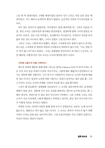 %ubb38%ud654 %uc18d%uc73c%ub85c 21%uadf8%ub0a0 %ubc24 %ub531 %ud55c%ubc88%uc774%uc5c8%ub2e4. 3%uac1c%uc6d4 %uc608%uc815%uc774%uc5c8%ub358 %ud074%ub9ac%ub2c9 %uc784%uc2dc %uadfc%ubb34%ub294 %ub2e4%uc74c %ub0a0%ub85c %ub05d%ub0a0 %uc608%uc815%uc774%uc5c8%uace0, %uc5b4%ub290 %ub54c%ubcf4%ub2e4 %ub2a6%uac8c%uae4c%uc9c0 %ud658%uc790%uac00 %ub9ce%uc558%ub2e4. %uc21c%uac04%uc801%uc778 %uc624%ub9cc%uacfc %uc774%uae30%uc2ec%uc774%uc5c8%uc744 %uac83%uc774%ub2e4. %uc544%ubb34 %uc77c%ub3c4 %uc77c%uc5b4%ub098%uc9c0 %uc54a%uc558%ub2e4%uba74, %uc544%ubb34%ub807%uc9c0%ub3c4 %uc54a%uac8c %ud758%ub824%ubc84%ub9b4 %uc77c. %uadf8%ub7ec%ub098 %ub2e4%uc74c%ub0a0 %uc544%uce68, %ud751%uc778 %uc18c%ub140%ub294 %uc2e0%uc6d0%ubbf8%uc0c1%uc758 %ubcc0%uc0ac%uccb4%ub85c %ubc1c%uacac%ub418%uc5c8%ub2e4. %ub0c9%uc815%ud558%uac8c %ub9d0%ud574 %uadf8%ub140%uc758 %uc798%ubabb%uc740 %uc544%ub2d0%uc9c0%ub3c4 %ubaa8%ub978%ub2e4. %uc9c4%ub8cc %uc2dc%uac04 %uc774%ud6c4%uc600%uace0, %uc751%uae09%ud658%uc790%ub3c4 %uc544%ub2c8%uc5c8%uc73c%uba70, %ubb34%uc5c7%ubcf4%ub2e4 %uce58%ub8cc%ub97c %ud558%uc9c0 %uc54a%uc544 %uc8fd%uc740 %uac83%ub3c4 %uc544%ub2c8%ub77c%uace0 %ud588%ub2e4. %uadf8%ub7ec%ub2c8 %uacbd%ucc30%ub3c4 %uadf8%ub0e5 %uc78a%uc73c%ub77c%uace0 %ud55c%ub2e4. %uadf8%ub7ec%ub098 %uadf8%ub140%ub294 %uadf8%ub807%uac8c %ud558%uc9c0 %ubabb%ud588%ub2e4. %uc138%uc0c1%uc740 %uadf8%ub140%uc5d0%uac8c %uc544%ubb34 %uc798%ubabb%uc774 %uc5c6%ub2e4%uace0 %ud558%uc9c0%ub9cc, %ud558%ub290%ub2d8%uc740 %uadf8%ub140%uc5d0%uac8c %ub2e8 %ud55c%ubc88%uc758 %uc678%uba74%uacfc %ubb34%uc2ec%ud568%uc870%ucc28 %ud5c8%ub77d%ud558%uc9c0 %uc54a%uc73c%uc2dc%uba70, %u201c%ub108%ub294 %uc815%ub9d0 %uc544%ubb34 %uc8c4%uac00 %uc5c6%ub290%ub0d0?%u201d%ub77c%uace0 %ubb3c%uc5c8%ub2e4. %uadf8%ub140%ub294 %uc885%ud569%ubcd1%uc6d0 %uc77c%uc790%ub9ac%uae4c%uc9c0 %ud3ec%uae30%ud558%uace0 %ub204%uad70%uc9c0%ub3c4, %ubb34%uc5c7 %ub54c%ubb38%uc5d0, %uc5b4%ub5bb%uac8c %uc8fd%uc740 %uc9c0%ub3c4 %ubaa8%ub974%ub294 %uc18c%ub140%uc758 %ud589%uc801%uc744 %ucc3e%uc544 %ub098%uc120%ub2e4. %uc758%ubb34%ub97c %uc18c%ud640%ud788 %ud55c %uc8c4%ub97c %uace0%ubc31%ud558%uc624%ub2c8%uc81c%ub2c8%uc758 %uc120%ud0dd%uacfc %ud589%ub3d9%uc744 %ud1b5%ud574 %uc601%ud654 <%uc5b8%ub178%uc6b4 %uac78(The Unknown Girl)>%uc774 %ubcf4%uc5ec %uc8fc%ub824%ub294 %uac83%uc740 %uc6b0%ub9ac %ubaa8%ub450 %uc77c%uc0c1 %uc18d%uc5d0%uc11c %ubb34%uc2ec%ud788 %uc9c0%ub098%uac00%uac70%ub098, %uadf8%ub807%uac8c %ud574%ub3c4 %uad1c%ucc2e%uac70%ub098 %ub2f9%uc5f0%ud558%ub2e4%uace0 %uc5ec%uae30%ub294 %uac83%ub4e4%uc5d0 %ub300%ud55c %uc131%ucc30%uc774%ub2e4. %uadf8%ub140 %uc5ed%uc2dc %ud070 %uc0ac%uba85%uac10%uc774%ub098 %uc2e0%ub150%uc73c%ub85c %uc18c%ub140%uc758 %uc8fd%uc74c%uc5d0 %ub9e4%ub2ec%ub9b0 %uac83%uc740 %uc544%ub2c8%ub2e4. %uc591%uc2ec%uc758 %uc18c%ub9ac%uc5d0 %uadc0%ub97c %uae30%uc6b8%uc774%uace0, %uc591%uc2ec%uc774 %uc6c0%uc9c1%uc774%ub294 %ub300%ub85c %uac14%uc744 %ubfd0, %uadf8%ub9ac%uace0 %uc544%ubb34%ub3c4 %ubaa8%ub974%ub294 %uc18c%ub140%uc758 %uc874%uc7ac%ub97c, %uc8fd%uc74c%uc758 %uc9c4%uc2e4%uc744 %uc54c%uace0 %uc2f6%uc744 %ubfd0%uc774%uc5c8%ub2e4. %uadf8%uac83%uc774 %uc65c %uc911%uc694%ud560%uae4c? %uc131%ub9e4%ub9e4%ub97c %uac15%uc694%ud558%ub2e4%uac00 %uadf8 %uc18c%ub140%ub97c %uc2e4%uc871%uc0ac%ud558%uac8c %ub9cc%ub4e0 %ub0a8%uc790%uc640%uc758 %ub300%ud654%uac00 %ub2f5%uc744 %uc900%ub2e4. %uacbd%ucc30%uc5d0 %uac00%uc11c %ubaa8%ub4e0 %uc9c4%uc2e4%uc744 %ubc1d%ud788%ub77c%ub294 %uc81c%ub2c8%uc758 %uc694%uad6c%uc5d0 %ub0a8%uc790%ub294 %uc65c %uadf8%ub798%uc57c %ud558%ub0d0%uba70, %uc8fd%uc5c8%uc73c%uba74 %ub2e4 %ub05d%ub09c %uac83%uc774 %uc544%ub2c8%ub0d0%uba70 %uac70%ubd80%ud55c%ub2e4. %uadf8%ub7f0 %uadf8%uc5d0%uac8c %uadf8%ub140%ub294 %uc8fd%uc740 %uc18c%ub140%uac00 %uc9c0%uae08 %uc6b0%ub9ac%uc5d0%uac8c %uadf8%ub807%uac8c %ud574%ub2ec%ub77c%uace0 %ubd80%ud0c1%ud558%uace0 %uc788%ub2e4%uba70, %ub05d%ub09c %uac83%uc774 %uc544%ub2c8%uae30%uc5d0 %uc6b0%ub9ac%uac00 %uc774%ub807%uac8c %uad34%ub85c%uc6b4 %uac83%uc774%ub77c%uace0 %ub9d0%ud55c%ub2e4. %uc5b4%uca4c%uba74 %uc6b0%ub9ac%ub294 %ud0c0%uc778%uc758 %uc544%ud514%uacfc %ubd88%ud589 %uc55e%uc5d0 %ubaa8%ub450%uac00 %uacf5%ubc94%uc77c%uc9c0%ub3c4 %ubaa8%ub978%ub2e4. %ub208%uc5d0 %ubcf4%uc774%uc9c0 %uc54a%ub294%ub2e4%uace0, %ubab0%ub790%ub2e4%uace0 %uc8c4%uac00 %uc5c6%ub294 %uac83%uc740 %uc544%ub2c8%ub2e4. %uadf8 %ubaa8%ub974%ub294 %uc8c4%uae4c%uc9c0 %uc800%uc9c0%ub974%uc9c0 %uc54a%uae30 %uc704%ud574%uc11c%ub77c%ub3c4 %uc6b0%ub9ac%ub294 %ubb38%uc744 %uc5f4%uace0 %uc0b4%uc544%uac00%uc57c %ud55c%ub2e4. %uadf8%ub7f0 %ubaa8%uc2b5%uc774%uc57c%ub9d0%ub85c %uc8fc%ub2d8 %uc0ac%ub791%uc758 %uc2e4%ucc9c%uc774%uace0, %uc8fc%ub2d8%uc774 %ubc14%ub77c%ub294 %uc138%uc0c1%uc774 %uc544%ub2d0%uae4c.