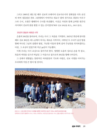 %uc120%uad50 %uc774%uc57c%uae30 29%uadf8%ub9ac%uace0 2005%ub144 3%uc6d4 2%uc77c %ud398%ub8e8 %uc120%uad50%uc758 %ubaa8%ud0dc%uc774%uba70 %uc120%uad50%uc0ac%ub85c%uc11c%uc758 %uc815%uccb4%uc131%uc744 %ub354%uc6b1 %uad73%uac74%ud788 %ud558%uba70 %uc815%ub4e4%uc5c8%ub358 %uae50%ub610 %uadf8%ub780%ub370%uc5d0%uc11c %uc544%uc57c%uafb8%ucd08 %ub300%uad50%uad6c %uc644%ub530 %uae50%uac00%ub9ac%ub85c %ucd5c%uc885%uc219 %uc544%uc6b0%uad6c%uc2a4%ud0c0 %uc218%ub140, %uc624%ud604%uc8fc %ubca8%ubca0%ub69c%uc544 %uc218%ub140%ub97c %ud30c%uacac%ud588%ub2e4. %uc774%uacf3%uc740 %uc790%uc5f0%uacfc %ud568%uaed8 %uc21c%ubc15%ud55c %uc6d0%uc8fc%ubbfc %uc0ac%uc774%uc5d0%uc11c %uc120%uad50%uc758 %uafc8%uc744 %ud3bc%uce60 %uc218 %uc788%ub294 %uacf3%uc774%uc5c8%ub2e4(%u300e%ud398%ub8e8 %uc120%uad50 20%ub144%uc744 %ud68c%uace0%u300f, 2015 %ucc38%uc870).30%ub144%uc758 %uacb0%uc2e4%uacfc %uc0c8%ub85c%uc6b4 %uc2dc%uc791%uc740%ucd1d%uc758 30%ub144%uc744 %ub3cc%uc544%ubcf4%uba70, %uc6b0%ub9ac%ub294 %ub2e4%uc2dc %uadf8 %ucc98%uc74c%uc744 %uae30%uc5b5%ud55c%ub2e4. 2025%ub144 %ud76c%ub144%uc5d0 %ub9de%uc774%ud55c %ud398%ub8e8 %uc120%uad50 30%ub144%uc740 %ud558%ub290%ub2d8%uaed8%uc11c %uc5ec%uc2dc%ub294 %uc0c8%ub85c%uc6b4 %uc2dc%uc791%uc774%ub2e4. 1995%ub144 %ub450 %uc218%ub140%uac00 %ub0af%uc120 %ub545%uc744 %ud5a5%ud574 %ub5a0%ub098%ub358 %uadf8%ub0a0%uc758 %uc124%ub818%uacfc %ub5a8%ub9bc, %uac00%ub09c%ud55c %uc774%ub4e4%uacfc %ud568%uaed8 %uc0b4%uba70 %uc8fc%ub2d8%ub9cc%uc744 %uc758%uc9c0%ud558%uaca0%ub2e4%ub294 %ub2e4%uc9d0, %uadf8 %ucd08%uc2ec%uc774 %uc788%uc5c8%uae30%uc5d0 %uc9c0%ub09c 30%ub144%uc774 %uac00%ub2a5%ud588%ub2e4. %uc774%uc81c %uc6b0%ub9ac%ub294 %ub2e4%uc2dc %ucd08%uc2ec%uc73c%ub85c %ub3cc%uc544%uac00%ub824 %ud55c%ub2e4. %uc601%uc6d0%ud55c %ub3c4%uc6c0%uc758 %uc131%ubaa8%ub2d8 %uc190%uc744 %uaf2d %uc7a1%uace0, %ubcf5%uc74c%uc758 %uc528%uc557%uc744 %uc2ec%uc73c%ub7ec %ub5a0%ub0ac%ub358 %uadf8 %ub9c8%uc74c%uc73c%ub85c %uc55e%uc73c%ub85c%uc758 30%ub144%uc744 %ud5a5%ud574 %ub098%uc544%uac04%ub2e4.%uadf8 %uae38%uc5d0%uc11c %ubcc0%ud568%uc5c6%ub294 %ub3d9%ubc18%uc790%uc778 %uc5ec%ub7ec%ubd84%ub4e4%uc758 %uae30%ub3c4%uc640 %uc0ac%ub791%uc740, %uc120%uad50 %uc0ac%uba85%uc744 %uc774%uc5b4%uac00%ub294 %uc6b0%ub9ac%uc5d0%uac8c %uac00%uc7a5 %ud070 %ud798%uc774 %ub420 %uac83%uc774%ub2e4.2012. 6. 1. %uacf5%uc0ac %uc911%uc778 %uae50%uac00%ub9ac %uc218%ub140%uc6d0%uc744 %ubc29%ubb38%ud55c %uc544%uc57c%uafb8%ucd08 %ub300%uad50%uad6c %uac00%ube44%ub178 %ubcf4%uc88c%uc8fc%uad50%uc640 %ud3c9%uc2e0%ub3c4%ub4e4%uc67c%ucabd%ubd80%ud130 %uc624%ud604%uc8fc %ubca8%ubca0%ub69c%uc544 %uc218%ub140, %uac00%ube44%ub178 %ubcf4%uc88c%uc8fc%uad50, %ubc15%uc740%uacbd %uc740%uacbd%uc544%ub15c%uc2a4 %uc218%ub140, %uc55e%uc904 %ucd5c%uc885%uc219 %uc544%uc6b0%uad6c%uc2a4%ud0c0 %uc218%ub140