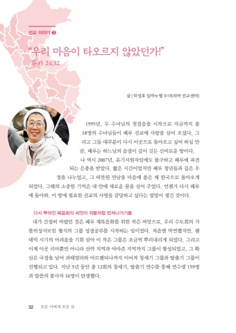 32 %ubaa8%ub4e0 %uc774%uc5d0%uac8c %ubaa8%ub4e0 %uac831995%ub144, %ub450 %uc218%ub140%ub2d8%uc758 %uccab%uac78%uc74c%uc744 %uc2dc%uc791%uc73c%ub85c %uc9c0%uae08%uae4c%uc9c0 %ucd1d 18%uba85%uc758 %uc218%ub140%ub2d8%ub4e4%uc774 %ud398%ub8e8 %uc120%uad50%uc5d0 %uc0ac%ub791%uc744 %uc2ec%uc5b4 %uc624%uc168%ub2e4. %uadf8%ub9ac%uace0 %uadf8%ub4e4 %ub300%ubd80%ubd84%uc774 %ub2e4%uc2dc %uc774%uacf3%uc73c%ub85c %ub3cc%uc544%uc624%uace0 %uc2f6%uc5b4 %ud558%uc2e4 %ub9cc%ud07c, %ud398%ub8e8%ub294 %ud558%ub290%ub2d8%uc758 %uc228%uacb0%uc774 %uae4a%uc774 %uae43%ub4e0 %uc2e0%ube44%ub85c%uc6b4 %ub545%uc774%ub2e4.%ub098 %uc5ed%uc2dc 2007%ub144, %uc720%uae30%uc11c%uc6d0%uc790%uc784%uc5d0%ub3c4 %ubd88%uad6c%ud558%uace0 %ud398%ub8e8%uc5d0 %ud30c%uacac%ub418%ub294 %uc740%ucd1d%uc744 %ubc1b%uc558%ub2e4. %uc9e7%uc740 %uc2dc%uac04%uc774%uc5c8%uc9c0%ub9cc %ud398%ub8e8 %uccad%ub144%ub4e4%uacfc %uae4a%uc740 %uc6b0%uc815%uc744 %ub098%ub204%uc5c8%uace0, %uadf8 %ub530%ub73b%ud55c %ub9cc%ub0a8%uc744 %ub9c8%uc74c%uc5d0 %ud488%uc740 %ucc44 %ud55c%uad6d%uc73c%ub85c %ub3cc%uc544%uc624%uac8c %ub418%uc5c8%ub2e4. %uadf8%ub54c%uc758 %uc18c%uc911%ud55c %uae30%uc5b5%uc740 %ub0b4 %uc548%uc5d0 %uc0c8%ub85c%uc6b4 %uafc8%uc744 %uc2ec%uc5b4 %uc8fc%uc5c8%ub2e4. %uc5b8%uc820%uac00 %ub2e4%uc2dc %ud398%ub8e8%uc5d0 %ub3cc%uc544%uc640, %uc774 %ub545%uc5d0 %ud544%uc694%ud55c %uc120%uad50%uc758 %uc0ac%uba85%uc744 %uac10%ub2f9%ud558%uace0 %uc2f6%ub2e4%ub294 %uc5f4%ub9dd%uc774 %uc0dd%uae34 %uac83%uc774%ub2e4.%ub2e4%uc2dc %ubfcc%ub824%uc9c4 %ubcf5%uc74c%ud654%uc758 %uc528%uc557%uc774 %uc950%ubd88%ucc98%ub7fc %ubc88%uc838%ub098%uac00%uae30%ub97c%ub0b4%uac00 %uac04%uc808%ud788 %ubc14%ub790%ub358 %uac83%uc740 %ud398%ub8e8 %uc7ac%ubcf5%uc74c%ud654%ub97c %uc704%ud55c %uc791%uc740 %uc528%uc557%uc73c%ub85c, %uc6b0%ub9ac %uc218%ub3c4%ud68c%uc758 %uac00%ud1a8%ub9ad%uc131%uc11c%ubaa8%uc784 %ud615%uc2dd%uc758 %uadf8%ub8f9 %uc131%uacbd%uacf5%ubd80%ub97c %uc2dc%uc791%ud558%ub294 %uc77c%uc774%uc5c8%ub2e4. %ucc98%uc74c%uc5d4 %ub9c9%uc5f0%ud588%uc9c0%ub9cc, %ud32c%ub370%ubbf9 %uc2dc%uae30%uc758 %uc5b4%ub824%uc6c0%uc744 %uae30%ud68c %uc0bc%uc544 %uc774 %uc791%uc740 %uadf8%ub8f9%uc740 %uc870%uae08%uc529 %ubfcc%ub9ac%ub0b4%ub9ac%uac8c %ub418%uc5c8%ub2e4. %uadf8%ub9ac%uace0 %uc774%uc81c %uc774%uacf3 %ub9ac%ub9c8%ubfd0%ub9cc %uc544%ub2c8%ub77c %uc0b0%uc545 %uc9c0%uc5ed%uacfc %uc544%ub9c8%uc874 %uc9c0%uc5ed%uae4c%uc9c0 %uadf8%ub8f9%uc774 %ud615%uc131%ub418%uc5c8%uace0, %uadf8 %ud655%uc0b0%uc740 %uad6d%uacbd%uc744 %ub118%uc5b4 %uacfc%ud14c%ub9d0%ub77c%uc640 %uc544%ub974%ud5e8%ud2f0%ub098%uae4c%uc9c0 %uc774%uc5b4%uc838 %ucc3d%uc138%uae30 %uadf8%ub8f9%uacfc %ud0c8%ucd9c%uae30 %uadf8%ub8f9%uc774 %uc9c4%ud589%ub418%uace0 %uc788%ub2e4. %uc9c0%ub09c 5%ub144 %ub3d9%uc548 %ucd1d 12%ud68c%uc758 %ucc3d%uc138%uae30, %ud0c8%ucd9c%uae30 %uc5f0%uc218%ub97c %ud1b5%ud574 %uc5f0%uc218%uc0dd 159%uba85%uacfc %ub9d0%uc500%uc758 %ubd09%uc0ac%uc790 16%uba85%uc774 %ud0c4%uc0dd%ud588%ub2e4. %uc120%uad50 %uc774%uc57c%uae30 %u278c%u201c%uc6b0%ub9ac %ub9c8%uc74c%uc774 %ud0c0%uc624%ub974%uc9c0 %uc54a%uc558%ub358%uac00!%u201d%ub8e8%uce74 24,32%uae00 | %ubc15%uc815%ud638 %uc784%ub9c8%ub204%uc5d8 %uc218%ub140(%ub9ac%ub9c8 %uc120%uad50%uc13c%ud130)