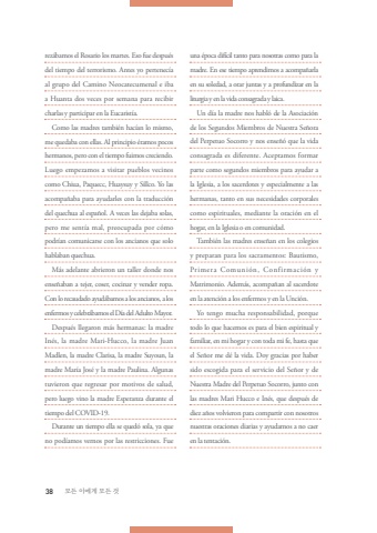 38 %ubaa8%ub4e0 %uc774%uc5d0%uac8c %ubaa8%ub4e0 %uac83rez%u00e1bamos el Rosario los martes. Eso fue despu%u00e9s del tiempo del terrorismo. Antes yo pertenec%u00eda al grupo del Camino Neocatecumenal e iba a Huanta dos veces por semana para recibir charlas y participar en la Eucarist%u00eda.Como las madres tambi%u00e9n hac%u00edan lo mismo, me quedaba con ellas. Al principio %u00e9ramos pocos hermanos, pero con el tiempo fuimos creciendo. Luego empezamos a visitar pueblos vecinos como Chiua, Paquecc, Huaysuy y Sillco. Yo las acompa%u00f1aba para ayudarles con la traducci%u00f3n del quechua al espa%u00f1ol. A veces las dejaba solas, pero me sent%u00eda mal, preocupada por c%u00f3mo podr%u00edan comunicarse con los ancianos que solo hablaban quechua.M%u00e1s adelante abrieron un taller donde nos ense%u00f1aban a tejer, coser, cocinar y vender ropa. Con lo recaudado ayud%u00e1bamos a los ancianos, a los enfermos y celebr%u00e1bamos el D%u00eda del Adulto Mayor.Despu%u00e9s llegaron m%u00e1s hermanas: la madre In%u00e9s, la madre Mari-Hucco, la madre Juan Madlen, la madre Clarisa, la madre Suyoun, la madre Mar%u00eda Jos%u00e9 y la madre Paulina. Algunas tuvieron que regresar por motivos de salud, pero luego vino la madre Esperanza durante el tiempo del COVID-19.Durante un tiempo ella se qued%u00f3 sola, ya que no pod%u00edamos vernos por las restricciones. Fue una %u00e9poca dif%u00edcil tanto para nosotras como para la madre. En ese tiempo aprendimos a acompa%u00f1arla en su soledad, a orar juntas y a profundizar en la liturgia y en la vida consagrada y laica.Un d%u00eda la madre nos habl%u00f3 de la Asociaci%u00f3n de los Segundos Miembros de Nuestra Se%u00f1ora del Perpetuo Socorro y nos ense%u00f1%u00f3 que la vida consagrada es diferente. Aceptamos formar parte como segundos miembros para ayudar a la Iglesia, a los sacerdotes y especialmente a las hermanas, tanto en sus necesidades corporales como espirituales, mediante la oraci%u00f3n en el hogar, en la Iglesia o en comunidad.Tambi%u00e9n las madres ense%u00f1an en los colegios y preparan para los sacramentos: Bautismo, Primera Comuni%u00f3n, Confirmaci%u00f3n y Matrimonio. Adem%u00e1s, acompa%u00f1an al sacerdote en la atenci%u00f3n a los enfermos y en la Unci%u00f3n.Yo tengo mucha responsabilidad, porque todo lo que hacemos es para el bien espiritual y familiar, en mi hogar y con toda mi fe, hasta que el Se%u00f1or me d%u00e9 la vida. Doy gracias por haber sido escogida para el servicio del Se%u00f1or y de Nuestra Madre del Perpetuo Socorro, junto con las madres Mari Hucco e In%u00e9s, que despu%u00e9s de diez a%u00f1os volvieron para compartir con nosotros nuestras oraciones diarias y ayudarnos a no caer en la tentaci%u00f3n.