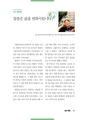 %uc120%uad50 %uccb4%ud5d8 39%uac00%ud1a8%ub9ad%uc131%uc11c%ubaa8%uc784%uc5d0%uc11c%uc758 %ub0b4 %uc5ec%uc815%uc740 5%ub144 %uc804, %ucd5c%uc885%uc219 %uc544%uc6b0%uad6c%uc2a4%ud0c0 %uc218%ub140%ub2d8%uc758 %ucc3d%uc138%uae30 %uadf8%ub8f9%uacf5%ubd80%uc5d0 %ucd08%ub300%ub418%uba74%uc11c %uc2dc%uc791%ub418%uc5c8%ub2e4. %ub2e8%uc21c%ud55c %uc131%uacbd %uacf5%ubd80%ub85c %uc0dd%uac01%ud588%uc9c0%ub9cc %uc804%ud600 %uc0c8%ub85c%uc6b4 %ubaa8%ud5d8%uc758 %uc2dc%uc791%uc774%uc5c8%ub2e4. %ud32c%ub370%ubbf9 %uc2dc%uae30%ub77c %ube44%ub300%uba74 %ubaa8%uc784%uc774%uc5c8%uc9c0%ub9cc, %uac01 %ubaa8%uc784%uc740 %uc601%uc801%uc73c%ub85c %uae4a%uace0 %ubc30%uc6c0%uc774 %uac00%ub4dd%ud55c %uc2dc%uac04%uc774%uc5c8%ub2e4. %ubaa8%ub4e0 %ub9cc%ub0a8%uc740 %ubbff%uc74c%uc758 %uc138%uacc4%ub85c %ub4e4%uc5b4%uac00%ub294 %ucc3d%uc774 %ub418%uc5c8%uace0, %ud558%ub290%ub2d8%uc758 %ub9d0%uc500%uc744 %ub354 %uae4a%uc774 %uc54c%uc544%uac00%ub294 %uc5ec%uc815%uc774%uc5c8%ub2e4. %uccab %ubc88%uc9f8 %uc5f0%uc218%ub97c %uccb4%ud5d8%ud55c %ud6c4, %uadf8 %ube5b%uc744 %uacc4%uc18d %ub098%ub204%uc5b4%uc57c %ud55c%ub2e4%ub294 %ub9c8%uc74c%uc758 %uc6b8%ub9bc%uc744 %ub290%uaf08%uace0, %ubd09%uc0ac%uc790%ub85c%uc11c %uadf8 %uae38%uc744 %ud568%uaed8 %uac78%uc5b4%uac00%uc57c%uaca0%ub2e4%uace0 %uacb0%uc2ec%ud558%uac8c %ub418%uc5c8%ub2e4.%ub9d0%uc500%uc758 %ubd09%uc0ac%uc790%ub294 %ub530%ub73b%ud558%uace0 %uc6a9%uac10%ud55c %ub9c8%uc74c%uc73c%ub85c %uccad%ub144%ub4e4%uc744 %uc778%ub3c4%ud558%ub294 %ubc15%uc815%ud638 %uc784%ub9c8%ub204%uc5d8 %uc218%ub140%ub2d8%uc744 %ud1b5%ud574 %uc774%ub8e8%uc5b4%uc84c%ub2e4. %ub098%ub294 %ub0b4%uac00 %uc18d%ud55c %ub9ac%ub9c8 %ube44%uc57c %uc5d8 %uc0b4%ubc14%ub3c4%ub974%ubfd0 %uc544%ub2c8%ub77c %ud398%ub8e8 %ud574%uc548 %uc9c0%uc5ed %ud2b8%ub8e8%ud788%uc694, %uc2ec%uc9c0%uc5b4 %uacfc%ud14c%ub9d0%ub77c %uadf8%ub8f9%uae4c%uc9c0%ub3c4 %ub3d9%ud589%ud558%ub294 %uc740%ucd1d%uc744 %ub204%ub9b4 %uc218 %uc788%uc5c8%ub2e4. %uadf8%ub8f9%uacf5%ubd80%ub098 %uc5f0%uc218%ub97c %ud1b5%ud574 %uccad%ub144%ub4e4%uc774 %ud558%ub290%ub2d8%uc744 %uae4a%uc774 %uccb4%ud5d8%ud558%ub294 %uac83%uc744 %ubcf4%uc558%uace0, %uc774%ub294 %ub098%uc5d0%uac8c%ub3c4 %uae4a%uc740 %uc601%uac10%uc744 %uc8fc%ub294 %ub610 %ud558%ub098%uc758 %uccb4%ud5d8%uc774 %ub418%uc5c8%ub2e4. %ubd09%uc0ac%uc790%ub85c%uc11c %uac00%uc7a5 %uac10%ub3d9%ubc1b%ub294 %uc21c%uac04%uc740 %uc131%uacbd %ub9d0%uc500%uc774 %uc0ac%ub78c%ub4e4%uc758 %ub9c8%uc74c%uc744 %uae4a%uc774 %uc6b8%ub9ac%ub294 %uac83%uc744 %ubcfc %ub54c%uc774%ub2e4. %uc758%ubb38%uc744 %ud488%uace0, %uac1c%uc778%uc801%uc778 %ub2f5%uc744 %ucc3e%uae30 %uc704%ud574 %ucc3e%uc544%uc624%ub294 %ub9ce%uc740 %uc774%ub4e4%uc774 %uacf5%ub3d9%uccb4 %uc548%uc5d0%uc11c%uc758 %uae4a%uc774 %uc788%ub294 %ub098%ub214%uc744 %ud1b5%ud574%uc11c %ub9d0%uc500%uc744 %ub9cc%ub098%uac8c %ub418%uace0, %uadf8 %ub9d0%uc500%uc774 %uc601%ud63c%uc5d0 %uc9c1%uc811 %ub9d0%uc744 %uac78%uba70, %uc77c%uc0c1 %uc548%uc5d0%uc11c %uc0b4%uc544 %uc6c0%uc9c1%uc774%ub294 %uac83%uc744 %uccb4%ud5d8%ud55c%ub2e4. %uc5b4%ub5a4 %uc774%ub4e4%uc740 %ucc98%uc74c%uc73c%ub85c %ud558%ub290%ub2d8%uc758 %ud06c%uc2e0 %uc0ac%ub791%uc744 %ubc1c%uacac%ud558%uace0, %ub610 %uc5b4%ub5a4 %uc774%ub4e4%uc740 %uc55e%uc73c%ub85c %ub098%uc544%uac08 %ud798%uc744 %uc5bb%uc5b4 %uc0c8%ub85c%uc6b4 %uadf8%ub8f9%uacfc %ud568%uaed8%ud558%uae30 %uc704%ud574 %ubd09%uc0ac%uc790%ub85c%uc11c %ub098%uc544%uac00%uae30%ub85c %uacb0%uc2ec%ud55c%ub2e4.%uc120%uad50 %uccb4%ud5d8 %u278c %ub9d0%uc500%uc740 %uc0b6%uc744 %ubcc0%ud654%uc2dc%ud0b5%ub2c8%ub2e4%uae00 | %uae00%ub85c%ub9ac%uc544 %ub9c8%ub9ac%uc544 %ube68%ub77c%uc2dc%uc624 %uc138%uad6c%ub77c(%uac00%ud1a8%ub9ad%uc131%uc11c%ubaa8%uc784 %ubd09%uc0ac%uc790)