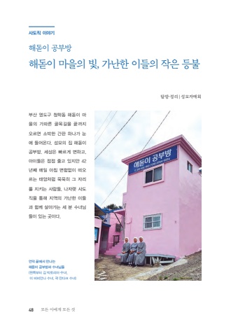 48 %ubaa8%ub4e0 %uc774%uc5d0%uac8c %ubaa8%ub4e0 %uac83%ubd80%uc0b0 %uc601%ub3c4%uad6c %uccad%ud559%ub3d9 %ud574%ub3cb%uc774 %ub9c8%uc744%uc758 %uac00%ud30c%ub978 %uace8%ubaa9%uae38%uc744 %ub05d%uae4c%uc9c0 %uc624%ub974%uba74 %uc18c%ubc15%ud55c %uac04%ud310 %ud558%ub098%uac00 %ub208%uc5d0 %ub4e4%uc5b4%uc628%ub2e4. %uc131%ubaa8%uc758 %uc9d1 %ud574%ub3cb%uc774 %uacf5%ubd80%ubc29. %uc138%uc0c1%uc740 %ube60%ub974%uac8c %ubcc0%ud558%uace0, %uc544%uc774%ub4e4%uc740 %uc810%uc810 %uc904%uace0 %uc788%uc9c0%ub9cc 42%ub144%uc9f8 %ub9e4%uc77c %uc544%uce68 %ubcc0%ud568%uc5c6%uc774 %ub5a0%uc624%ub974%ub294 %ud0dc%uc591%ucc98%ub7fc %ubb35%ubb35%ud788 %uadf8 %uc790%ub9ac%ub97c %uc9c0%ud0a4%ub294 %uc0ac%ub78c%ub4e4, %ub098%uc790%ub81b %uc0ac%ub3c4%uc9c1%uc744 %ud1b5%ud574 %uc9c0%uc5ed%uc758 %uac00%ub09c%ud55c %uc774%ub4e4%uacfc %ud568%uaed8 %uc0b4%uc544%uac00%ub294 %uc138 %ubd84 %uc218%ub140%ub2d8%ub4e4%uc774 %uc788%ub294 %uacf3%uc774%ub2e4.%uc5b8%ub355 %ub05d%uc5d0%uc11c %ub9cc%ub098%ub294 %ud574%ub3cb%uc774 %uacf5%ubd80%ubc29%uacfc %uc218%ub140%ub2d8%ub4e4(%uc67c%ucabd%ubd80%ud130 %uae40 %ube45%ud1a0%ub9ac%uc544 %uc218%ub140, %uc774 %ube44%ube44%uc548%ub098 %uc218%ub140, %uacfd %uc7cc%ub2e4%ud06c %uc218%ub140)%uc0ac%ub3c4%uc9c1 %uc774%uc57c%uae30%ud574%ub3cb%uc774 %uacf5%ubd80%ubc29%ud574%ub3cb%uc774 %ub9c8%uc744%uc758 %ube5b, %uac00%ub09c%ud55c %uc774%ub4e4%uc758 %uc791%uc740 %ub4f1%ubd88%ud0d0%ubc29%u00b7%uc815%ub9ac | %uc131%ubaa8%uc790%ub9e4%ud68c