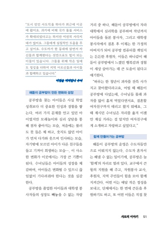 %uc0ac%ub3c4%uc9c1 %uc774%uc57c%uae30 51%u201c%ub3c4%uc2dc %ube48%ubbfc %uc0ac%ub3c4%uc9c1%uc744 %ud558%ub2e4%uac00 %ucd5c%uadfc%uc5d0 %uc774%uacf3%uc5d0 %uc654%uc5b4%uc694. %uacfc%uac70%uc5d0 %ube44%ud574 %uad6d%uac00 %ub3cc%ubd04 %uc11c%ube44%uc2a4%uac00 %ud655%ub300%ub418%uc5c8%ub2e4%uace0%ub294 %ud558%uc9c0%ub9cc %uc5ec%uc804%ud788 %uc0ac%uac01%uc9c0%ub300%uac00 %ub9ce%uc9c0%uc694. %uadf8%ub4e4%uc5d0%uac8c %uc2e4%uc9c8%uc801%uc778 %ub3c4%uc6c0%uc744 %uc8fc%uace0 %uc2f6%uc5b4%uc694. %uc218%ub3c4%uc790%uac00 %ud55c %ub3d9%ub124%uc5d0 %uc0b4%uba74%uc11c %uc790%uc2e0%ub4e4%uacfc %ud568%uaed8%ud55c%ub2e4%ub294 %uac83%ub9cc%uc73c%ub85c%ub3c4 %ud798%uc774 %ub418%ub294%uc774%ub4e4%uc774 %uc788%uc2b5%ub2c8%ub2e4. %uadf8%ub4e4%uc744 %uc704%ud574 %uc791%uc740 %uc77c%uc5d0%ub3c4 %uc815%uc131%uc744 %ub2e4%ud558%uba70 %uc9c0%uc5ed %uc5b4%ub974%uc2e0%ub4e4%uacfc %uc544%uc774%ub4e4%uacfc %ud568%uaed8%ud558%uace0 %uc788%uc2b5%ub2c8%ub2e4.%u201d%uc774%uc815%uc21c %ube44%ube44%uc548%ub098 %uc218%ub140%ud574%ub3cb%uc774 %uacf5%ubd80%ubc29%uc774 %ub9cc%ub4e0 %ubcc0%ud654%uc640 %uc131%uc7a5%uacf5%ubd80%ubc29%uc744 %ucc3e%ub294 %uc544%uc774%ub4e4%uc740 %uc0ac%uc2e4 %ud559%uc5c5 %uc131%ucde8%ubcf4%ub2e4 %ub354 %uc911%uc694%ud55c %uc778%uc131%uacfc %uacbd%ud5d8%uc744 %uc313%ub294%ub2e4. %uc5ec%ub7ec %uac00%uc9c0 %ubb38%uc81c%ub97c %uc548%uace0 %uc788%ub358 %uc544%uc774%uc600%uc9c0%ub9cc %ubaa8%ub798%ub180%uc774%uc640 %uc2ec%ub9ac %uc0c1%ub2f4%uc744 %ud1b5%ud574 %uc810%ucc28 %uc88b%uc544%uc9c0%ub294 %ubaa8%uc2b5, %ucc98%uc74c%uc5d0%ub294 %ubd88%ub7ec%ub3c4 %ubabb %ub4e4%uc740 %uccb4 %ud558%uace0, %uc6c3%uc9c0%ub3c4 %uc54a%ub358 %uc544%uc774%uac00 %uba3c%uc800 %ub2e4%uac00%uc640 %uc6c3%uc73c%uba70 %uc778%uc0ac%ud558%ub294 %ubaa8%uc2b5, %uc790%uae30%ubc16%uc5d0 %ubaa8%ub974%ub358 %uc544%uc774%uac00 %ub2e4%ub978 %uce5c%uad6c%ub4e4%uc744 %ub3d5%uace0 %uae30%uaebc%uc774 %ud76c%uc0dd%ud558%ub294 %ubaa8%uc2b5%u2026. %uc774 %uc0ac%uc18c%ud55c %ubcc0%ud654%uac00 %uc774%uacf3%uc5d0%uc11c%ub294 %uac00%uc7a5 %ud070 %uae30%uc068%uc774 %ub41c%ub2e4. %uc218%ub140%ub2d8%ub4e4%uc740 %uc544%uc774%ub4e4%uc758 %uc131%uc7a5%uc744 %uccb4%uac10%ud558%uba70, %uc544%uc774%ub4e4%uc740 %ubcc0%ud654%ub420 %uc218 %uc788%uc73c%ub2c8 %ub04a%uc784%uc5c6%uc774 %uae30%ub2e4%ub824%uc918%uc57c %ud55c%ub2e4%ub294 %uac83%uc744 %uc2e4%uac10%ud55c%ub2e4. %uacf5%ubd80%ubc29%uc744 %uc878%uc5c5%ud55c %uc544%uc774%ub4e4%uacfc %ub300%ud559%uc0dd %ubd09%uc0ac%uc790%ub4e4%uc758 %uc131%uc7a5%ub3c4 %ube7c%ub193%uc744 %uc218 %uc5c6%ub294 %uc790%ub791%uac70%ub9ac %uc911 %ud558%ub098. %ud574%ub3cb%uc774 %uacf5%ubd80%ubc29%uc5d0%uc11c %uc790%ub77c %ub300%ud559%uc5d0%uc11c %uc2ec%ub9ac%ud559%uc744 %uacf5%ubd80%ud558%uba70 %uc791%ub144%uae4c%uc9c0 %uc544%uc774%ub4e4%uc744 %ub3cc%ubcf8 %ubd09%uc0ac%uc790, %uadf8%ub9ac%uace0 %ub300%ud559%uc0dd %ubd09%uc0ac%uc790%uc5d0%uc11c %uacb0%ud63c %ud6c4 %uc774%uc81c%ub294 %ud55c %uac00%uc815%uc758 %uc544%ubc84%uc9c0%uac00 %ub418%uc5b4 %uacf5%ubd80%ubc29 %ucef4%ud4e8%ud130%ub97c %ucc45%uc784%uc9c0%ub294 %ub4e0%ub4e0%ud55c %ud6c4%uc6d0%uc790. %uc774%ub4e4%uc740 %ud558%ub098%uac19%uc774 %ud574%ub3cb%uc774 %uacf5%ubd80%ubc29%uc5d0%uc11c %ub290%uaf08%ub358 %ud589%ubcf5%uac10%uacfc %uacbd%ud5d8%uc774 %uc138%uc0c1 %uc0b4%uc544%uac00%ub294 %ub370 %ud070 %ub3c4%uc6c0%uc774 %ub41c%ub2e4%uace0 %uc598%uae30%ud55c%ub2e4. %u201c%ud558%ub8e8%ub294 %ud55c %uccad%ub144%uc774 %uacfc%uc790%ub97c %uc794%ub729 %uc0ac%uac00%uc9c0%uace0 %ucc3e%uc544%uc654%ub354%ub77c%uace0%uc694, %uc5b4%ub9b4 %ub54c %ud574%ub3cb%uc774 %uacf5%ubd80%ubc29%uc5d0 %ub2e4%ub154%ub294%ub370, %uc218%ub140%ub2d8%ub4e4 %ubab0%ub798 %uacfc%uc790%ub97c %ub9ce%uc774 %ud6d4%uccd0 %uba39%uc5c8%ub2e4%uba74%uc11c%uc694. %uacb0%ud63c%ud560 %uc5ec%uc790%uce5c%uad6c%uae4c%uc9c0 %ub370%ub9ac%uace0 %uc654%uc9c0 %ubb50%uc608%uc694. %uadf8%ub54c %uacc4%uc2dc%ub358 %uc218%ub140%ub2d8%uc740 %uc790%ub9ac%ub97c %uc62e%uaca8 %uc774%uc820 %uc548 %uacc4%uc2e4 %uac70%ub77c%ub294 %uac78 %uc54c%uc9c0%ub9cc %uc5ec%uc790%uce5c%uad6c%uc5d0%uac8c %uc18c%uac1c%ud558%uace0 %uc790%ub791%ud558%uace0 %uc2f6%uc5c8%ub2e4%uace0.%u201d%ud568%uaed8 %ub9cc%ub4e4%uc5b4%uac00%ub294 %uacf5%ubd80%ubc29%ud574%ub3cb%uc774 %uacf5%ubd80%ubc29%uc758 %uc6b4%uc601%uc740 %uc218%ub3c4%uc790%ub4e4%ub9cc%uc73c%ub85c %uc774%ub904%uc9c0%uc9c0 %uc54a%ub294%ub2e4. %uc218%ub3c4%uc790 %ud63c%uc790%uc11c%ub294 %ud574%ub0bc %uc218 %uc5c6%ub294 %uc77c%uc774%uae30%uc5d0, %uacf5%ubd80%ubc29%uc740 %ub298 %u2018%ud568%uaed8%u2019%uc758 %uc790%ub9ac%ub85c %uc5f4%ub824 %uc788%ub2e4. %uad50%uad6c%uc5d0%uc11c %ud070 %ubaab%uc758 %uc9c0%uc6d0%uc744 %ud574 %uc8fc%uace0, %uc790%uc6d0%ubd09%uc0ac %uad50%uc0ac, %ud6c4%uc6d0%uc790, %uc9c0%uc5ed %uc8fc%ubbfc%ub4e4%uc774 %ud798%uc744 %ubaa8%uc544 %ud568%uaed8 %uc9c0%ucf1c%uac04%ub2e4. %uc5b4%ub5a4 %uc774%ub294 %ub9e4%ub2ec %uc791%uc740 %uc815%uc131%uc744 %ubcf4%ub0b4%uace0, %ub2e8%uccb4%uc5d0%uc11c%ub294 %ud55c %ubc88%uc5d0 %ud070%ub3c8%uc744 %ud6c4%uc6d0%ud558%uae30%ub3c4 %ud558%uace0, %ub610 %uc5b4%ub5a4 %uc774%ub4e4%uc740 %uc9c1%uc811 %ucc3e