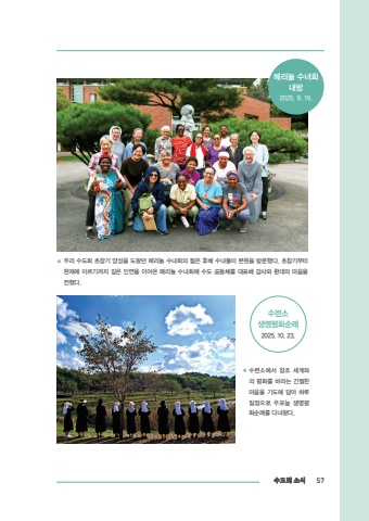 %uc218%ub3c4%ud68c %uc18c%uc2dd 57%u25b2 %uc6b0%ub9ac %uc218%ub3c4%ud68c %ucd08%ucc3d%uae30 %uc591%uc131%uc744 %ub3c4%uc654%ub358 %uba54%ub9ac%ub180 %uc218%ub140%ud68c%uc758 %uc80a%uc740 %ud6c4%ubc30 %uc218%ub140%ub4e4%uc774 %ubcf8%uc6d0%uc744 %ubc29%ubb38%ud588%ub2e4. %ucd08%ucc3d%uae30%ubd80%ud130 %ud604%uc7ac%uc5d0 %uc774%ub974%uae30%uae4c%uc9c0 %uae4a%uc740 %uc778%uc5f0%uc744 %uc774%uc5b4%uc628 %uba54%ub9ac%ub180 %uc218%ub140%ud68c%uc5d0 %uc218%ub3c4 %uacf5%ub3d9%uccb4%ub97c %ub300%ud45c%ud574 %uac10%uc0ac%uc640 %ud658%ub300%uc758 %ub9c8%uc74c%uc744 %uc804%ud588%ub2e4.%u25c0 %uc218%ub828%uc18c%uc5d0%uc11c %ucc3d%uc870 %uc138%uacc4%uc640%uc758 %ud3c9%ud654%ub97c %ubc14%ub77c%ub294 %uac04%uc808%ud55c %ub9c8%uc74c%uc744 %uae30%ub3c4%uc5d0 %ub2f4%uc544 %ud558%ub8e8 %uc77c%uc815%uc73c%ub85c %uc6b0%ud3ec%ub2aa %uc0dd%uba85%ud3c9%ud654%uc21c%ub840%ub97c %ub2e4%ub140%uc654%ub2e4.%uba54%ub9ac%ub180 %uc218%ub140%ud68c%ub0b4%ubc292025. 9. 19.%uc218%ub828%uc18c%uc0dd%uba85%ud3c9%ud654%uc21c%ub8402025. 10. 23.