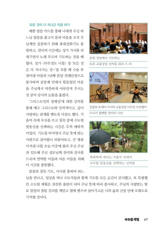 %uc218%ub3c4%uc6d0 %uccb4%ud5d8 67%ubaa8%ub4e0 %uac83%uc774 %ub2e4 %uc9c0%ub098%uac04 %uc9c0%uae08 %uc5ec%uae30 %uc608%uc05c %ub9d0%uc500 %uce74%ub4dc%ub97c %ud1b5%ud574 %ub098%uc5d0%uac8c %uc8fc%uc2e0 %ud558%ub290%ub2d8 %ub9d0%uc500%uc744 %ud488%uace0%uc11c %ubab8%uacfc %ub9c8%uc74c%uc744 %uc624%uc9c1 %uc8fc%ub2d8%uaed8%ub9cc %uc9d1%uc911%ud558%uae30 %uc704%ud574 %ud734%ub300%uc804%ud654%uae30%ub3c4 %ubd09%ud5cc%ud558%uace0, %ucc2c%ubbf8%uc758 %uc2dc%uac04%uc5d0%ub294 %uc131%uac00 %uac00%uc0ac%ub97c %ub418%uc0c8%uae30%uba74%uc11c %ub178%ub798 %ubd80%ub974%uba70 %uae30%ub3c4%ud558%ub294 %uac83%uc744 %ubc30%uc6e0%ub2e4. %uc131%uac00 <%uc544%ubb34%uac83%ub3c4 %ub108%ub97c> %uc911 %u2018%ubaa8%ub4e0 %uac83%uc740 %ub2e4 %uc9c0%ub098%uac00%ub294 %uac83~%u2019%uc744 %ubd80%ub97c %ub54c %uc218%uc220 %ud6c4 %uacaa%uc5b4%ub0b8 %uc544%ud514%uacfc 7%ub144%uc9f8 %ubcf8%ub2f9 %uc804%ub840%ub2e8%uc7a5%uc73c%ub85c %ubd09%uc0ac%ud558%uba70 %uacf5%ub3d9%uccb4 %uc548%uc5d0%uc11c %ud798%ub4e4%uc5c8%ub358 %ub9c8%uc74c%uc744 %uc8fc%ub2d8%uaed8%uc11c %ub530%ub73b%ud558%uac8c %uc5b4%ub8e8%ub9cc%uc838 %uc8fc%uc2dc%ub294 %uac83 %uac19%uc544 %uac10%uc0ac%uc758 %ub208%ubb3c%uc744 %ud758%ub838%ub2e4.%u2018%uadf8%ub9ac%uc2a4%ub3c4%uc778%uc758 %uc815%uccb4%uc131%u2019%uc5d0 %ub300%ud55c %uac15%uc758%ub97c %ud1b5%ud574 %uc608%uc218 %uadf8%ub9ac%uc2a4%ub3c4%uc640 %uc778%uaca9%uc801%uc774%uace0, %uae4a%uc774 %uc0ac%ub791%ud558%ub294 %uad00%uacc4%ub97c %ub9fa%ub3c4%ub85d %ub2e4%uc9d0%ub3c4 %ud588%ub2e4. %uac00%uc744%ube44 %uc18d%uc5d0 %uc6b0%uc0b0%uc744 %uc4f0%uace0 %uce68%ubb35 %uc911%uc5d0 %uc218%ub3c4%uc6d0 %ub4b7%ub3d9%uc0b0%uc744 %uc0b0%ucc45%ud558%ub294 %uc2dc%uac04%uc740 %ubb34%ucc99 %ub9e4%ub825%uc801%uc774%uc5c8%ub2e4. %uae30%ub3c4%ub97c %ubc14%uce58%uba74%uc11c %uc8fc%ub2d8 %ub73b%uc5d0 %ub9de%ub294 %uc0ac%ub78c%uc73c%ub85c %uc0b4%uc544%uc654%ub098 %ub418%ub3cc%uc544%ubcf4%uace0, %ud070 %ubcd1%uc744 %uc774%uaca8%ub0b8 %ub098%ub97c %uc624%ub298 %uc774%uacf3%uc5d0 %ubd88%ub7ec %uc8fc%uc2e0 %uc8fc%ub2d8%uacfc %uc778%ub3c4%ud574 %uc8fc%uc2e0 %uc131%ubaa8%ub2d8%uaed8 %ucc2c%ubbf8%uc640 %uac10%uc0ac%ub97c %ub4dc%ub9ac%uba70 %uc5f0%uc57d%ud55c %uc774%ub4e4%uacfc %uc544%ud508 %uc774%ub4e4%uc744 %uc704%ud574%uc774 %uc2dc%uac04%uc744 %ubd09%ud5cc%ud588%ub2e4.%ub9d0%uc500%uacfc %uce68%ubb35 %uae30%ub3c4, %ubbf8%uc0ac%ub97c %ud1b5%ud558%uc5ec %ud558%ub290%ub2d8%uc744 %ub9cc%ub098%uace0, %uc77c%uc0c1%uc744 %ub5a0%ub098 %uc218%ub3c4%uc790%ub4e4%uacfc %ud568%uaed8 %uae30%ub3c4%ud55c %ubaa8%ub4e0 %uc21c%uac04%uc774 %uac10%uc0ac%ud588%uace0, %ub610 %ud2b9%ubcc4%ud588%ub358 %uc218%ub3c4%uc6d0 %uccb4%ud5d8%uc740 %uc794%uc794%ud55c %uc6b8%ub9bc%uc774 %ub418%uc5b4 %uc8fc%ub2d8 %ub73b%uc5d0 %ub530%ub77c %ubd09%uc0ac%ud558%uace0, %uc8fc%ub2d8%uc758 %uc0ac%ub791%ubc1b%ub294 %ub538%ub85c %ub9d0%uc500%uc758 %ucc38%ub41c %uc9c4%ub9ac%ub97c %uae68%ub2eb%uace0 %uc5f4%ub9e4 %ub9fa%uc73c%uba70 %uc0b4%uc544%uac00%uace0%ud508 %ub098%uc758 %uc0b6%uacfc %uc2e0%uc559 %uc548%uc5d0 %uc624%ub798%ub3c4%ub85d %uae30%uc5b5%ub420 %uac83%uc774%ub2e4. %uae40%ucda9%ud76c%ud638%uc138%uc544%uc218%ub140%uc640%uad50%ub3d9%uc131%ub2f9%uc774%uc218%uc9c4%uc218%uc9c4%uc5e0%ub9c8%uc218%ub140%uac00 %ud568%uaed8%ud55c %ucc2c%ubbf8%uc758 %uc2dc%uac04%ubcf8%uc6d0 %uc131%ub2f9%uc5d0%uc11c %uae30%ub3c4%ud558%ub294%uc18d%ucd08 %uad50%ub3d9%uc131%ub2f9 %uc2e0%uc790%ub4e4 2025. 9. 19.%ucd09%ucd09%ud558%uac8c %ub0b4%ub9ac%ub294 %uac00%uc744%ube44 %uc18d%uc5d0%uc11c%uc218%ub3c4%uc6d0 %ub4b7%ub3d9%uc0b0%uc744 %uc0b0%ucc45%ud558%ub294 %uc2e0%uc790%ub4e4