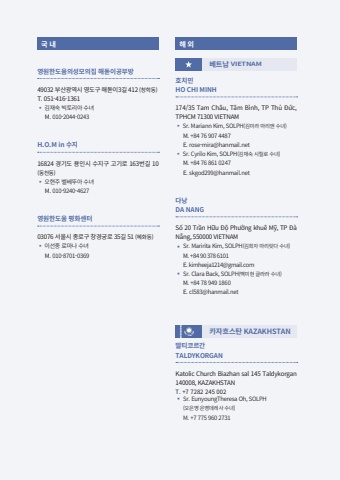 %uad6d %ub0b4%uc601%uc6d0%ud55c%ub3c4%uc6c0%uc758%uc131%ubaa8%uc758%uc9d1 %ud574%ub3cb%uc774%uacf5%ubd80%ubc2949032 %ubd80%uc0b0%uad11%uc5ed%uc2dc %uc601%ub3c4%uad6c %ud574%ub3cb%uc7743%uae38 412 (%uccad%ud559%ub3d9)T. 051-416-1361%u25aa %uae40%uc7ac%uc219 %ube45%ud1a0%ub9ac%uc544 %uc218%ub140 M. 010-2044-0243H.O.M in %uc218%uc9c016824 %uacbd%uae30%ub3c4 %uc6a9%uc778%uc2dc %uc218%uc9c0%uad6c %uace0%uae30%ub85c 163%ubc88%uae38 10 (%ub3d9%ucc9c%ub3d9)%u25aa %uc624%ud604%uc8fc %ubca8%ubca0%ub69c%uc544 %uc218%ub140 M. 010-9240-4627%uc601%uc6d0%ud55c%ub3c4%uc6c0 %ud3c9%ud654%uc13c%ud13003076 %uc11c%uc6b8%uc2dc %uc885%ub85c%uad6c %ucc3d%uacbd%uad81%ub85c 35%uae38 51 (%ud61c%ud654%ub3d9)%u25aa %uc774%uc120%uc911 %ub85c%ub9c8%ub098 %uc218%ub140 M. 010-8701-0369%ud574 %uc678%ubca0%ud2b8%ub0a8 VIETNAM%ud638%uce58%ubbfcHO CHI MINH174/35 Tam Ch%u00e2u, T%u00e2m B%u00ecnh, TP Th%u1ee7 %u0110%u1ee9c, TPHCM 71300 VIETNAM %u25aa Sr. Mariann Kim, SOLPH(%uae40%ubbf8%ub77c %ub9c8%ub9ac%uc564 %uc218%ub140)M. +84 76 907 4487E. rose-mira@hanmail.net%u25aa Sr. Cyrilo Kim, SOLPH(%uae40%uc7ac%uc219 %uc2dc%ub9b4%ub85c %uc218%ub140)M. +84 76 861 0247 E. skgod299@hanmail.net%ub2e4%ub0adDA NANGS%u1ed1 20 Tr%u1ea7n H%u1eefu %u0110%u1ed9 Ph%u01b0%u1eddng khu%u00ea M%u1ef9, TP %u0110%u00e0 N%u1eb5ng, 550000 VIETNAM %u25aa Sr. Maririta Kim, SOLPH(%uae40%ud76c%uc790 %ub9c8%ub9ac%ub9bf%ub2e4 %uc218%ub140)M. +84 90 378 6101E. kimheeja1214@gmail.com%u25aa Sr. Clara Back, SOLPH(%ubc31%ubbf8%ud604 %uae00%ub77c%ub77c %uc218%ub140)M. +84 78 949 1860E. cl583@hanmail.net%uce74%uc790%ud750%uc2a4%ud0c4 KAZAKHSTAN%ub538%ud2f0%ucf54%ub974%uac04TALDYKORGAN Katolic Church Biazhan sal 145 Taldykorgan 140008, KAZAKHSTANT. +7 7282 245 002%u25aa Sr. EunyoungTheresa Oh, SOLPH(%uc624%uc740%uc601 %uc740%uc601%ub370%ub808%uc0ac %uc218%ub140)M. +7 775 960 2731
