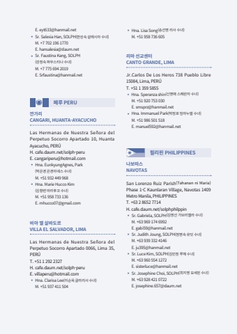 E. eyt633@hanmail.net%u25aa Sr. Salesia Han, SOLPH(%ud55c%uc131%uc219 %uc0b4%ub808%uc2dc%uc544 %uc218%ub140)M. +7 702 196 1770E. hansalesia@daum.net%u25aa Sr. Faustina Kang, SOLPH(%uac15%uc815%uc219 %ud30c%uc6b0%uc2a4%ud2f0%ub098 %uc218%ub140)M. +7 775 694 2019E. Srfaustina@hanmail.net%ud398%ub8e8 PERU%uae50%uac00%ub9acCANGARI, HUANTA-AYACUCHOLas Hermanas de Nuestra Se%u00f1ora del Perpetuo Socorro Apartado 10, Huanta Ayacucho, PER%u00daH. cafe.daum.net/solph-peru E. cangariperu@hotmail.com%u25aa Hna. EunkyungAgnes, Park(%ubc15%uc740%uacbd %uc740%uacbd%uc544%ub15c%uc2a4 %uc218%ub140)M. +51 932 449 968%u25aa Hna. Marie Hucco Kim(%uae40%ud5a5%ub828 %ub9c8%ub9ac%ud6c4%uaf2c %uc218%ub140)M. +51 958 733 136E. mhucco07@gmail.com%ube44%uc57c %uc5d8 %uc0b4%ubc14%ub3c4%ub974VILLA EL SALVADOR, LIMALas Hermanas de Nuestra Se%u00f1ora del Perpetuo Socorro Apartado 0066, Lima 35, PER%u00daT. +51 1 292 2327 H. cafe.daum.net/solph-peru E. villaperu@hotmail.com%u25aa Hna. Clarisa Lee(%uc774%uc21c%uc625 %uae00%ub77c%ub9ac%uc0ac %uc218%ub140)M. +51 937 411 504%u25aa Hna. Lisa Song(%uc1a1%uc120%uc601 %ub9ac%uc0ac %uc218%ub140)M. +51 958 736 605 %ub9ac%ub9c8 %uc120%uad50%uc13c%ud130CANTO GRANDE, LIMAJr.Carlos De Los Heros 738 Pueblo Libre 15084, Lima, PER%u00daT. +51 1 359 5855%u25aa Hna. Speranza shin(%uc2e0%uc601%uc560 %uc2a4%ud398%ub780%uc790 %uc218%ub140)M. +51 920 753 030E. smsprz@hanmail.net%u25aa Hna. Immanuel Park(%ubc15%uc815%ud638 %uc784%ub9c8%ub204%uc5d8 %uc218%ub140)M. +51 986 501 518E. manuel592@hanmail.net%ud544%ub9ac%ud540 PHILIPPINES%ub098%ubcf4%ub530%uc2a4NAVOTASSan Lorenzo Ruiz Parish(Tahanan ni Maria)Phase 1-C Kaunlaran Village, Navotas 1409 Metro Manila, PHILIPPINES T. +63 2 8652 7714 H. cafe.daum.net/solphphilppin%u25aa Sr. Gabriela, SOLPH(%uae40%uc601%uc120 %uac00%ube0c%ub9ac%uc5d8%ub77c %uc218%ub140)M. +63 969 174 6992E. gabi59@hanmail.net%u25aa Sr. Judith Joung, SOLPH(%uc815%uba85%uc219 %uc720%ub527 %uc218%ub140)M. +63 939 332 4146E. ju395@hanmail.net%u25aa Sr. Luce Kim, SOLPH(%uae40%ubbfc%uc815 %ub8e8%uccb4 %uc218%ub140)M. +63 960 554 1272E. sisterluce@hanmail.net%u25aa Sr. Josephine Choi, SOLPH(%ucd5c%uc9c0%uc601 %uc694%uc138%ud540 %uc218%ub140)M. +63 928 421 0722E. josephine.657@daum.net